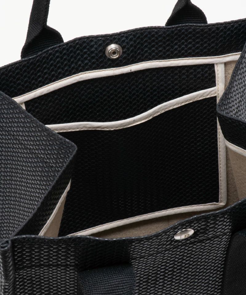 PVC素材を使用した、軽量で落ち着いた佇まいのハンドバッグ。コンパクトな見た目ながら、長財布やポーチがすっきりと収まる実用的なサイズ感が魅力。凹凸のある繊細なテクスチャーが、控えめながらも洗練された印象を添えます。端正なフォルムがスタイリングを引き締め、日常づかいから週末のお出かけまで、幅広く活躍します。