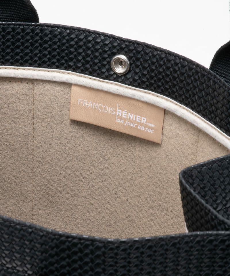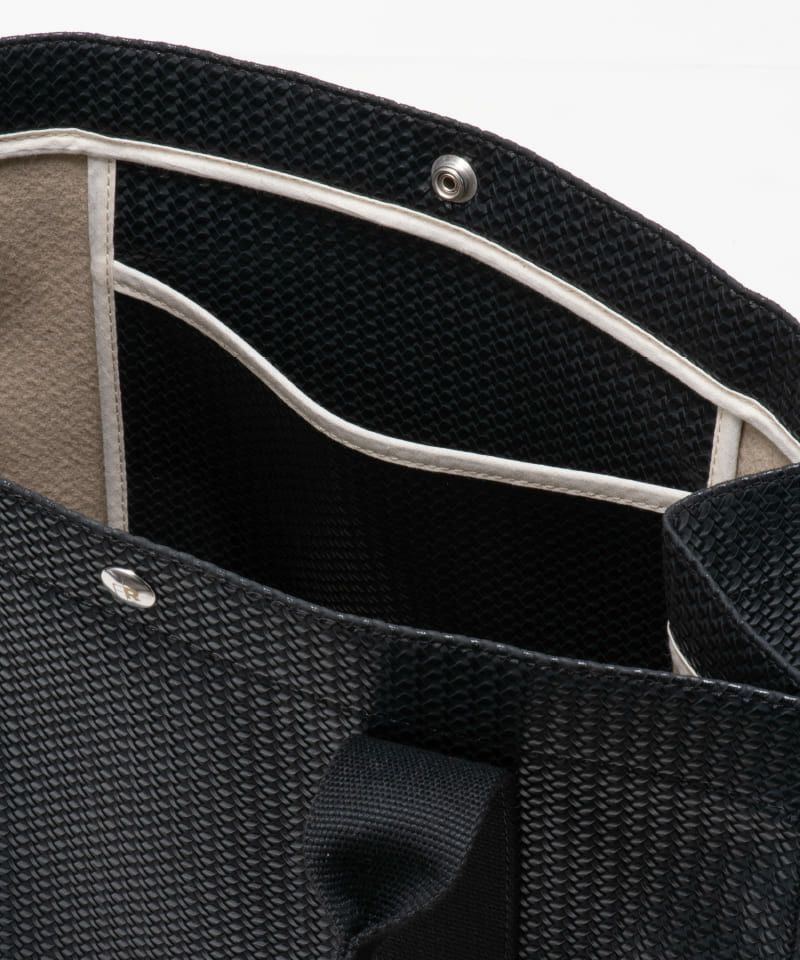 PVC素材を使用した、軽量かつ上品なトートバッグ。長めのハンドルで肩掛けも可能な、快適な持ち心地が魅力です。マチをすっきり仕立てることで、端正で美しい佇まいに。A4サイズの書類やPCもすっきり収まり、日常に寄り添うサイズ感。さりげない艶感が引き立つブラックが、装いを品よく引き締めます。