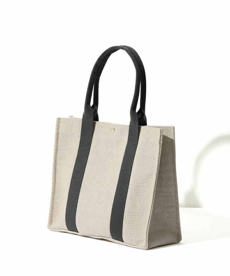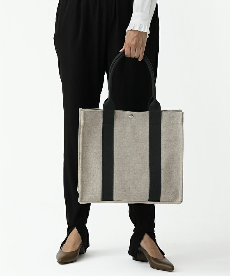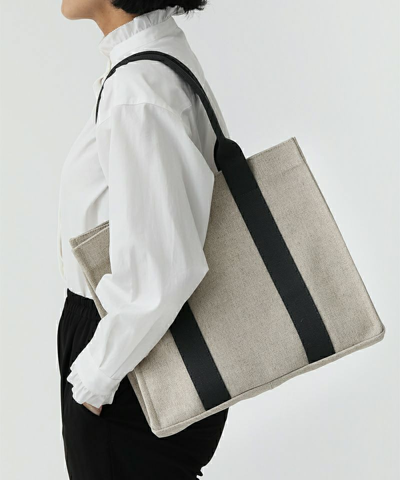 パートナーとシェアして使っていただけるように、マチやハンドルのディテールに工夫を施したオールジェンダー仕様のトートバッグ。通常のモデルと比べてハンドルの立ち上がりを長く取っているため、ジャケットやコートなどボリュームのあるアウターを着ている時の肩がけもスムーズ。PCや手帳、ポーチ、ガジェットケースなどたっぷり荷物が入る収納力を備えながらも、しっかり身体に寄り添い、スタイリングしやすいマチ幅で仕上げています。