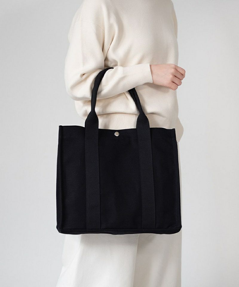 オールブラックの世界観で構築されたミニマルかつモードな「PLATO」。 インテリアファブリックにも使用されている上質なブラックコットンで、リュクスな素材感を表現。ハンドルの立ち上がりを長く取っているため、ジャケットやコートなどボリュームのあるアウターを着ている時の肩がけもスムーズ。PCや手帳、ポーチ、ガジェットケースなどたっぷり荷物が入る収納力を備えながらも、しっかり身体に寄り添い、スタイリングしやすいマチ幅で仕上げています。